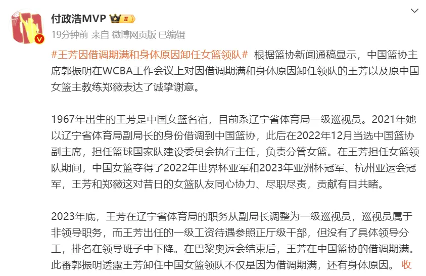 女篮巴黎奥运会惨败后体育集锦,历程泰半年的休整后,最近这一段本事,中国女篮也开启了新一轮的变动。前几天,中国篮协还是官宣主西宾郑薇下课,临时救火名帅宫鲁鸣将新官上任,接办中国女篮帅印。而近日,又有音讯传出,女篮领队王芳也卸任离队了。行动女篮夺取全国杯亚军两大功勋东说念主物,郑薇和王芳的离开,也标记着女篮将投入到全新期间,中国队还有望重返全国第二吗?