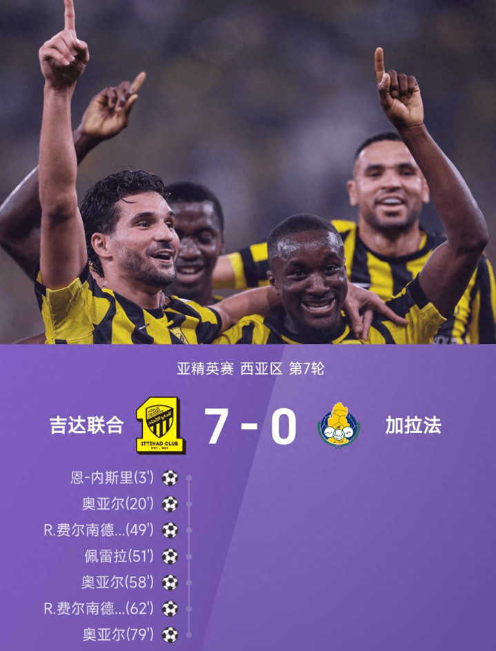 第七十九分钟,替补登场的加姆迪送出助攻,奥亚尔在禁区内推射破门,完成个东谈主本场帽子戏法。最终比分定格在7-0,吉达融合用一场完胜提前一轮晋级淘汰赛。